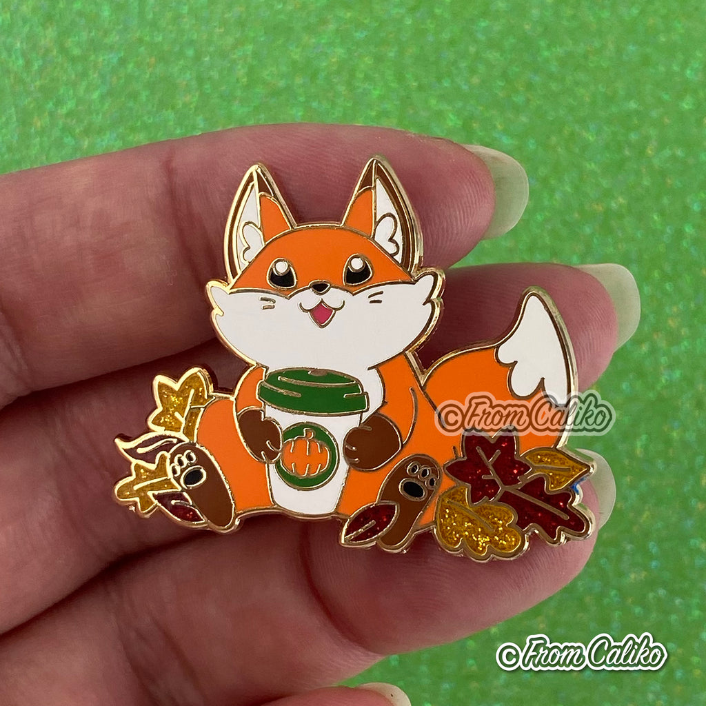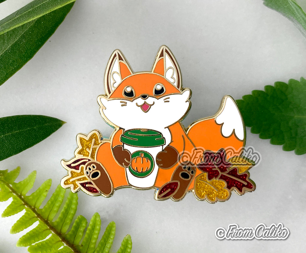 A chonky fox enjoying enjoying a PSL! This pin is about 1.5" with gold metal and glitter accents with 2 rubber clutches on the back. Just the right size to wear on your jacket collar or a backpack, the double posts on the back with rubber clutches will keep your pin securely in place. Select the locking back option for even more security.